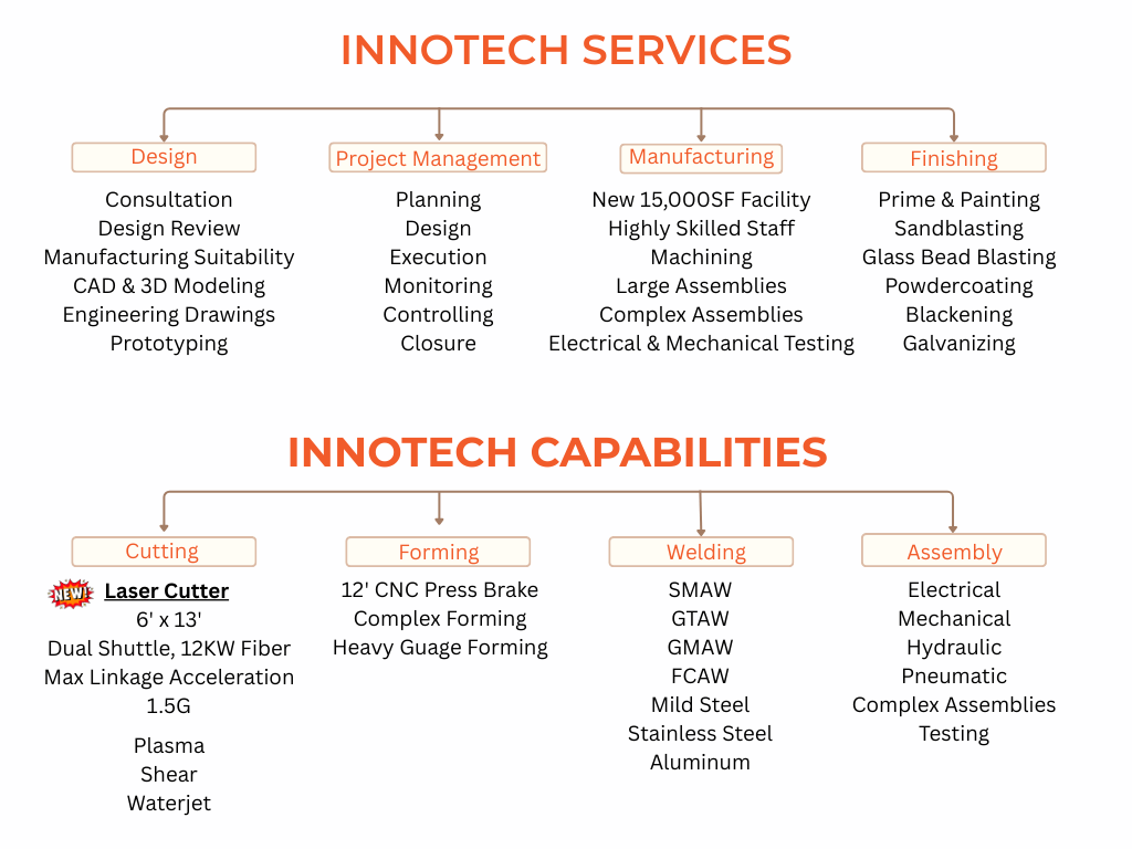 Innotech is an OEM designing and manufacturing Process Equipment for the agricultural, meat, dairy, and seafood industries. Our 15,000SF facility also allows us the opportunity to offer contract manufacturing services to companies looking for a reliable solution when they need additional manufacturing capabilities.